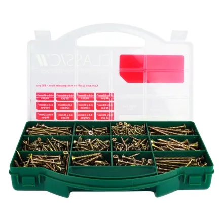The Classic Multi-Purpose Screws Mixed Tray offers an extensive selection of high-performance screws designed for versatility and reliability. Containing 895 pieces, this professional-grade assortment is ideal for use in hardwood, chipboard, MDF, plastic, and thin sheet metal applications. Each screw features a 25° sharp point and special thread design to deliver quick insertion, superior grip, and exceptional holding power.