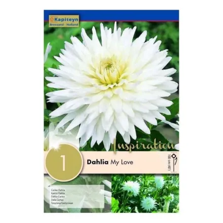 The Dahlia My Love X1 I is a striking cactus dahlia featuring elegant pure white flowers with a subtle greenish-yellow centre. Its distinctive spiky petals add texture and brightness to garden displays, making it a standout choice for both traditional and contemporary planting schemes.
