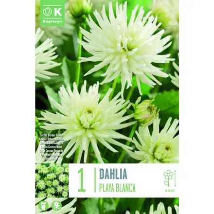 The Dahlia Playa Blanca X1 I is a dwarf semi-cactus dahlia with striking spiky white flowers and a bright yellow centre. Its unique star-like blooms shine in the garden from mid to late summer, continuing until the first frosts, adding charm and brightness to any planting area.