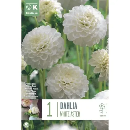 The Dahlia White Aster X1 I is a beautiful pompom dahlia featuring pure white blooms with tightly arranged, inrolled petals.
