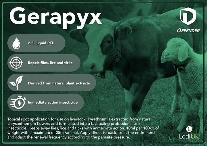 The Defender Gerapyx 1 Ltr is a fast-acting topical pour-on solution designed to repel and control flies, lice, and ticks on livestock. Ideal for use on cattle and sheep, it provides immediate protection against common external parasites, helping to improve animal comfort and overall wellbeing.