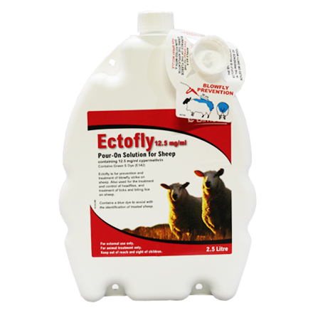 Ectofly Pour-On is used in the treatment and control of ticks, headflies and biting lice in sheep. Ectofly Pour-On is also used to prevent blowfly strike. Ectofly Pour-On also has a short withdrawal period of only 7 days making it the ideal product for lambs going to slaughter.
