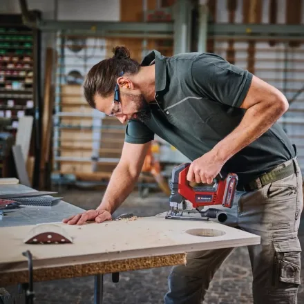 The Einhell 18V 135mm Professional Cordless Jig Saw (Body only) offers exceptional smooth operation for precise cuts up to 135mm deep in wood and 10mm in steel, with bevel cuts possible up to 45°. The switchable pendulum stroke enables quick cuts, while electronic speed control ensures optimal tool control for material-appropriate working.