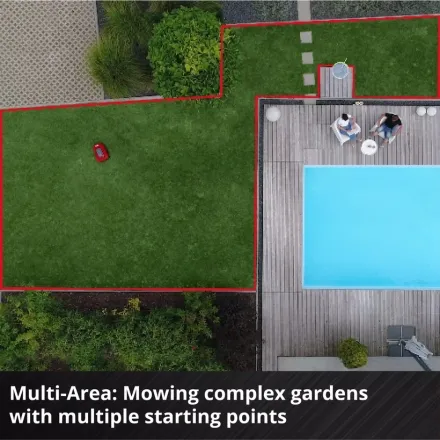 The Einhell 18V Robot Lawn Mower excels in complex gardens with its multi-area mowing function, enabling it to start from individually defined points along the boundary wire instead of just the charging station. The comprehensive safety sensor system includes impact, tilt, and lift sensors to detect obstacles independently, while the integrated rain sensor protects your lawn during wet conditions.