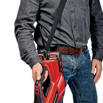 This Einhell Power X-Change 36V Cordless Leaf Blower can be used anywhere outside the home. It has an electronic speed control and a turbo switch for maximum blowing. It is powered by the Einhell PurePOWER brushless motor which is more powerful and longer lasting than conventional carbon brush motors. The length of the tube can be changed to suit the height of whoever is using the blower, no tools needed for this change. It has a balance handle with a soft grip so that it is comfortable and easy to hold for extended periods, the shoulder strap with shoulder pad also adds to this comfort. The metal ring at the end of the tube protects it from damage and extends its life. When finished using the tube detaches and the leaf blower has an integrated wall hanger to make storage easy. This Einhell Power X-Change 36V Cordless Leaf Blower is part of Einhill's power exchange series: all of the batteries in the range can be used with all of the the tools in the range. The batteries are all rechargeable. This leaf blower requires two 18V batteries (sold separately).