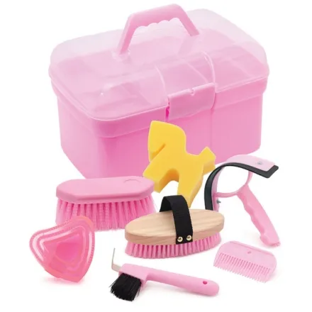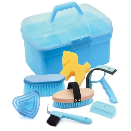 The Equisential Starter Grooming Box includes a comprehensive grooming kit with a body brush, dandy brush, mane comb, hoof pick, heart shaped curry comb, sweat scraper and horse shaped sponge. It also features a removable compartment for small items, along with a clear hinged lid with a secure latch and a handle for easy carrying.