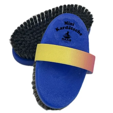 Designed with children in mind, the HAAS Kinderkardatsche - Blue features a vibrant rainbow elastic strap that provides a secure and comfortable grip while making grooming more enjoyable. The soft horsehair bristles are perfect for removing fine dust and adding a polished finish to the coat.