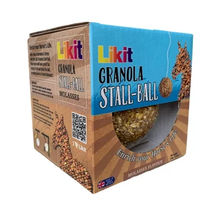 The Likit Granola Stall Ball is a practical stable treat that can last from a week to a month, depending on your horse and how the ball is hung. Its 1.6kg size makes it a substantial enrichment option for everyday stable use.