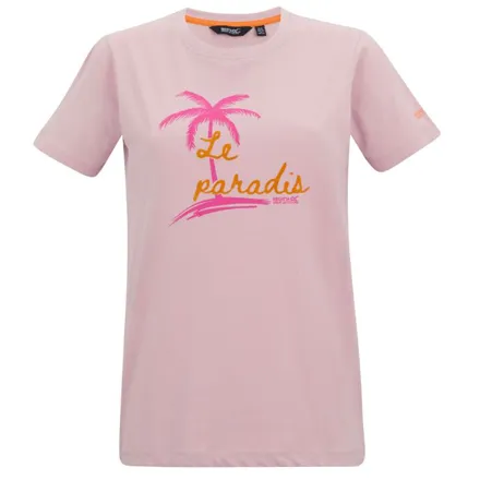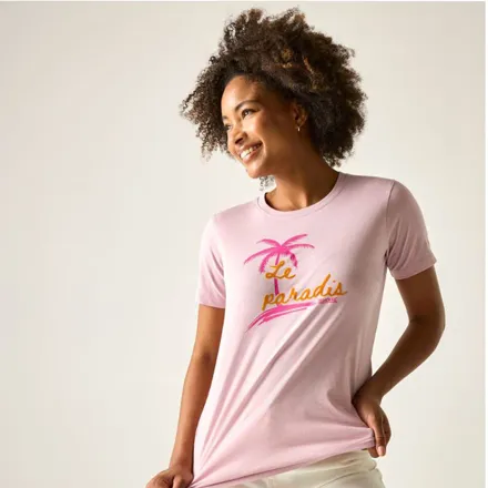 The Regatta Women's Filandra VX T-Shirt Haze Le Paradis combines style with comfort in this versatile cotton jersey top. Featuring a classic crew neck design and eye-catching graphic print with mixed applications, this T-shirt is crafted from 160gsm BCI cotton blend fabric, ensuring both durability and breathability for everyday wear.