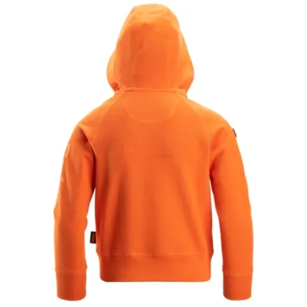 The Snickers 7512 Junior Logo Full-Zip Hoodie Warm Orange features an adjustable hood with a three-edged drawstring in yellow, black, and white, a convenient kangaroo pocket, and ribbed cuffs and bottom hem for a secure and comfortable fit. A high-build puff-print Snickers Workwear logo on the left sleeve adds a stylish and professional touch.