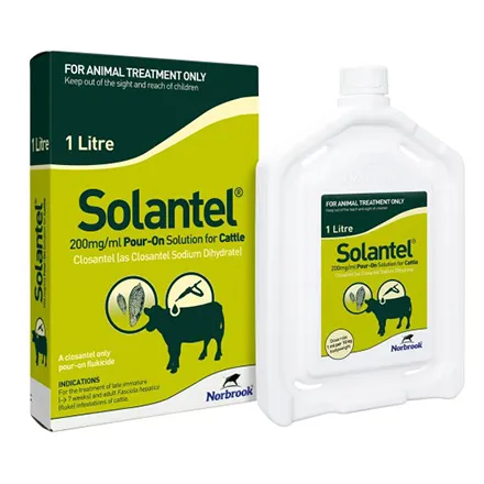 Solantel is a Closantel-based pour-on for the effective treatment of late immature (≥ 7 weeks) and adult Fasciola hepatica (fluke) in cattle.