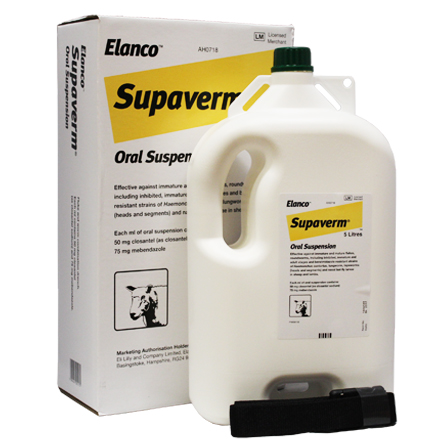 Supaverm Oral Drench is a highly effective orally administered treatment against immature and mature fluke, roundworms, lungworm, tapeworm (head and segments) and larval stages nasal bot fly in sheep and lambs. Supaverm Oral Drench also fights against immature and adult stages of haemonchus contortus, including benzimidazole resistant strains. It has also been found at the time of treatment that ticks feeding on the sheep produce fewer viable eggs.