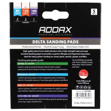 The Timco Delta Sanding Pads 5 Pack features high quality aluminium oxide abrasive with a high strength heat and wear resistant backing paper to provide a superior lifespan and improved extraction performance. Compatible with most leading brands of oscillating multi-tools including Bosch and DeWalt, these professional-grade sanding pads are ideal for heavy power sanding on a variety of surfaces including wood, paint, varnish, plaster, and filler. The Timco Delta Sanding Pads 5 Pack delivers exceptional results for both DIY enthusiasts and professional tradespeople who demand precision and reliability from their power tools.