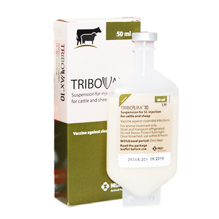 Tribovax 10 is a 4 in 1 clostridial vaccine for cattle and sheep for Blackleg, Braxy, Black Disease and Tetanus. Vaccination with Tribovax 10 induces an active immunity that protects the vaccinated animal for a period of up to 12 months. The long duration of immunity of Tribovax 10 ensures that vaccinated animals are protected all the year round and simplifies management procedures on the farm. Lambs and calves can be vaccinated from as young as 2 weeks of age. Vaccinating pregnant animals during the 2-6 weeks prior to parturition transfers immunity via the colostrum to the newborn animals shortly after birth and will protect the young animals for a period of 8-12 weeks. Tribovax 10 has been proven efficacious in the presence of maternally derived antibodies. It is recommended that animals with unknown colostrum status be vaccinated from 2 weeks of age. Those animals from vaccinated mothers and with confirmed colostrum intake should be vaccinated at 8-12 weeks old