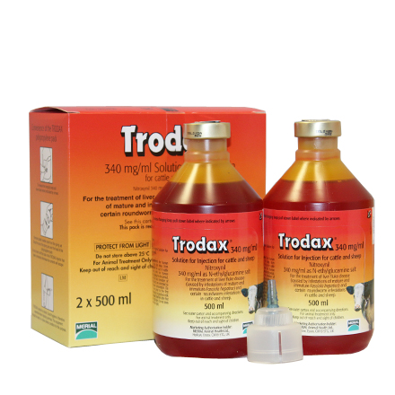 Trodax 34% Injection is a powerful flukicide for cattle and sheep. Trodax 34% Injection solution is indicated for the treatment of fascioliasis, the infestation of mature and immature fluke in cattle and sheep.