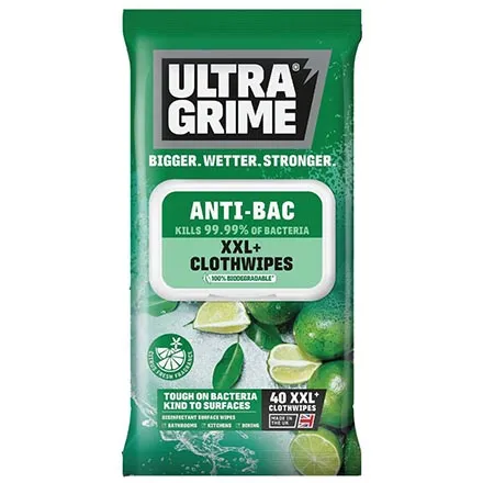 UltraGrime Anti-Bac Wipes XXL Pack of 40 provide powerful antibacterial cleaning performance in a strong and absorbent wipe. These wipes are designed for both hygiene and convenience, making them ideal for kitchens, workspaces, and more.